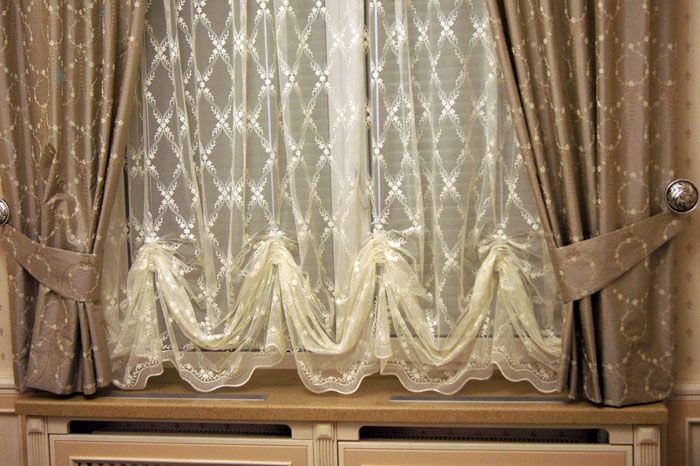 לייצור וילונות כאלה, בדים שקופים ומבריקים מתאימים יותר - כאשר הם מורכבים, הם מנצנצים יפה ויוצרים משחק גוונים אלגנטי. אם יש דפוס על הבד, אז הוא צריך להיות קטן ועמום. החומר עצמו נבחר די קליל כך שניתן יהיה לקפל אותו בקלות לקפלים חינניים. ניתן לקשט את המכפלת התחתונה עם תחרה, שוליים, ציציות.