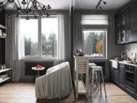 צבע אפור שייך גם לקטגוריה של אפשרויות אוניברסליות לקישוט פתיחת חלון. צבע זה משמש רקע ניטרלי לפרטי מבטא בהירים בפנים פנים ובחזיתות המטבח.