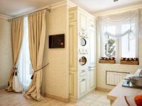 וילונות מטבח נבחרים לא רק על מנת להפוך את חלל המטבח, להפוך אותו לנוח יותר, אלא גם למטרה מעשית - בעזרתם תוכלו להשיג את החזותי הדרוש.על האפקט שמטרתו התאמת הפתרון התכנוני של החדר. דגם שנבחר כראוי יאפשר לך לתקן חזותית את הפרופורציות של חלון גדול מדי או קטן פתיחה, הפוך את החדר עצמו לגדול ומעלה.