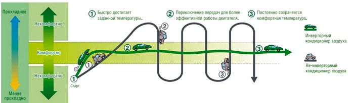 פעולת מערכת מפוצלת קונבנציונאלית מוצגת עם קו אפור. כאן המדחס מסוגל לבצע את תפקידיו רק במהירות קבועה, שמודגמת על ידי קטע (1). שינויי הטמפרטורה איטיים יותר בהשוואה למודל המהפך (עקומה ירוקה). על ידי שינוי התדירות תוכלו להגדיל את התפוקה, להשיג במהירות את התוצאה הרצויה.