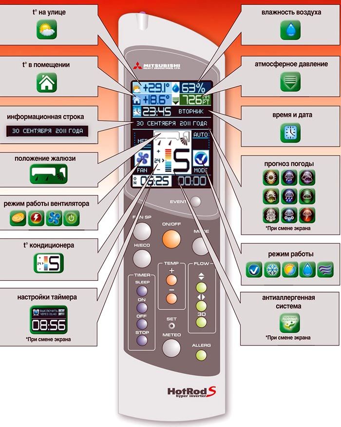 עם הציוד המתאים, הבעלים של ציוד זה יקבל מידע תפעולי על טמפרטורת האוויר בחוץ ובפנים. תצוגת הצבעים מציגה זמן ותאריך, לחות, לחץ אטמוספרי, תחזית מזג אוויר, תפריט, מצב פעולה. המשתמש יכול לשלוט בכיוון ובמהירות זרימת האוויר, להפעיל פילטרים נוספים. באמצעות הטיימר, הפעלה / השבתה מוגדרת על פי לוח זמנים ספציפי. מיוחד מצב הסרת לחות מבטל הצטברות של עיבוי ביחידה הפנימית, מבטל תנאים נוחים לחיים של מיקרואורגניזמים.