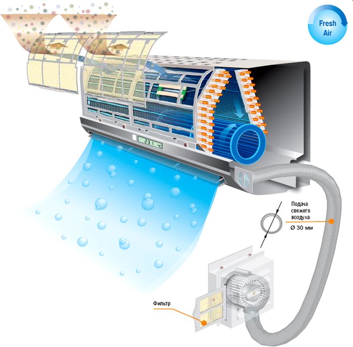 אבל במקום שלט רחוק עם פולט אינפרא אדום משתמשים במכשירים נייחים דומים להרכבה על הקיר. יחידות מקורה מותקנות בנתיבי צינור האוורור. במידת הצורך, הם משלימים עם פילטרים, גופי חימום. יתרון ברור הוא סודיות ההתקנה. חסרונות: