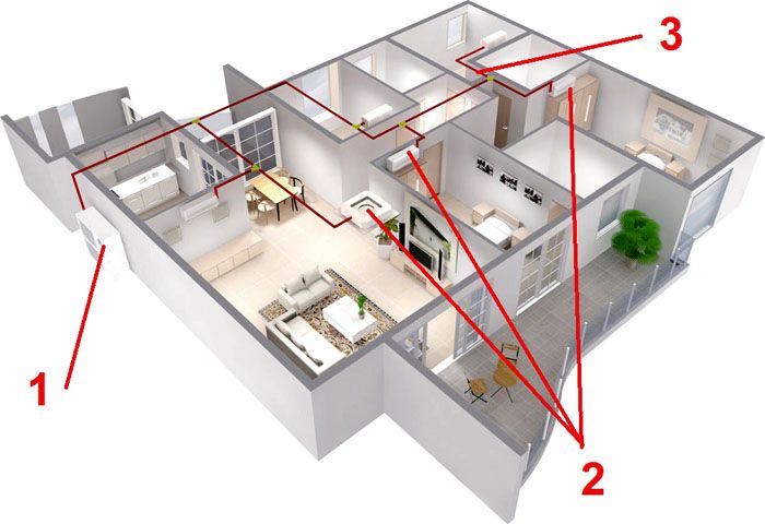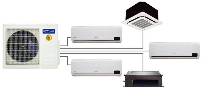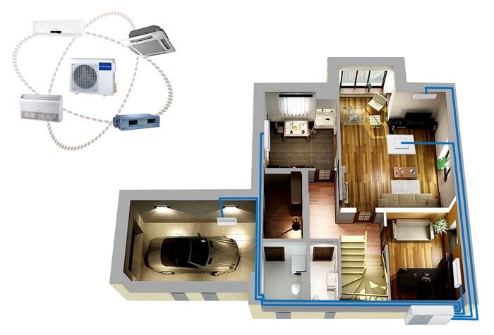 - השימוש במספר יחידות פנימיות (כמו באיור) מספק יצירת משטרי טמפרטורה עצמאיים בחדרים נפרדים. זה מגביר את האמינות הכוללת של המערכת בעקיפין.