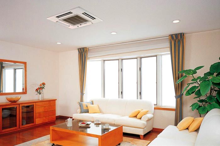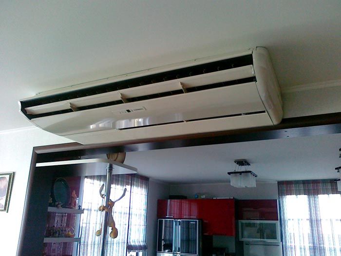 בתכנון זה, היחידה הפנימית תופסת מעט מקום. ככלל, הוא מותקן קרוב יותר לתקרה. התמונה אינה אפשרות אידיאלית, מכיוון שזרם האוויר הקר יפגע במשתמשים. זה מעורר הצטננות ומחלות אחרות. כדי לא לסבך את הפעולה עם הגדרות מורכבות, התקן אלמנטים אלה מעל ראש המיטה, מאחורי גב הספה.