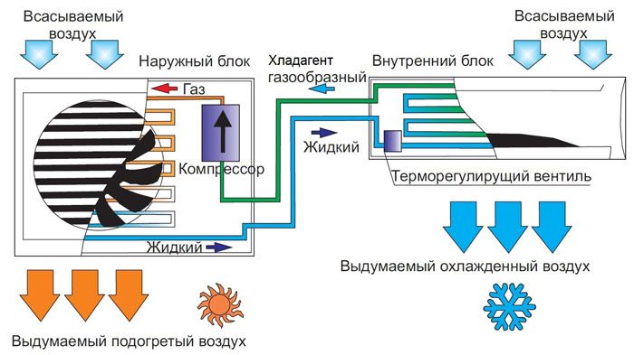 בעזרת נתון זה נבין בדיוק כיצד מתפקדת מערכת מפוצלת טיפוסית. המדחס יוצר את הלחץ במערכת הדרוש להזזת נוזל הקירור. כאשר מחממים, קירור המסופק מהחדר. ברחוב הוא מתקרר, הופך לנוזל. במצב זה, הוא נכנס למחליף החום של היחידה הפנימית, שם הוא מקרר את האוויר. כאן מתרחש המעבר לגז, אשר זורם דרך הצינורות אל המדחס. שסתום הבקרה המוצג באיור נשלט תוך התחשבות בבקרת טמפרטורת החדר.