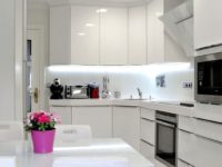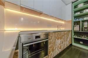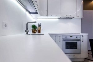 תוכלו גם להכין תאורת לד בעצמכם על ידי הדבקת רצועת הלד לתחתית הארונות התלויים של ערכת המטבח, ממש ליד הסינר. לא יהיה הבדל גדול ביעילות, ויעילות התאורה של אזור העבודה תגדל משמעותית. התנאי היחיד הוא להשתמש רצועת לד עם הגנת סיליקון חיצונית למניעת זיהום ונזק.