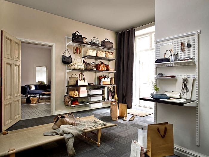 מדפים עם מגירות לדברים: מיקום המדפים במסדרון ובחדר ההלבשה