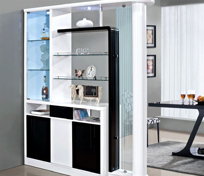 מחיצה ניידת תעזור לאנשים שלעתים קרובות משנים את חלל הפנים שלהם או זקוקים למסך זמני. זהו עיצוב על גלגלים קטנים. קל מאוד להזיז אותו מבלי לפגוע בתכולה על המדפים.