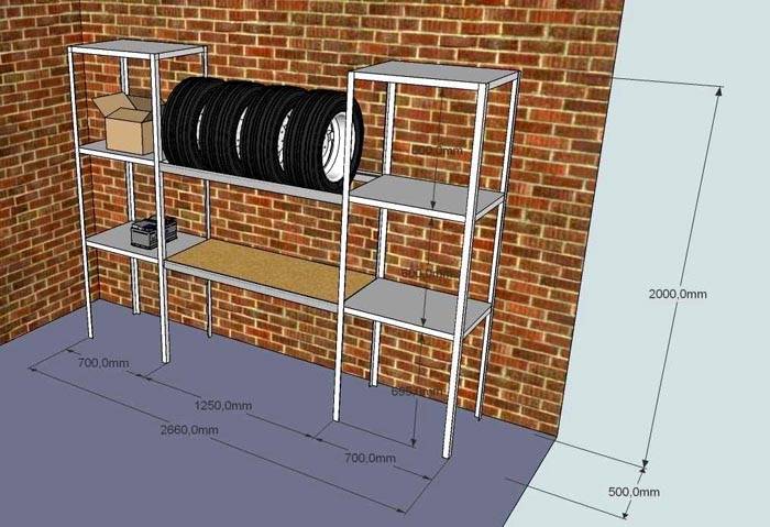 כפי שמוצג באיור, המיקום האנכי משמש לאחסון נכון של הגלגלים. במקרה זה אין צורך בריצוף. כאן אתה רק צריך להתקין איברים צולבים מתאימים, ללא קצוות חדים. זה ימנע נזק לצמיגים. עדיף להניח יריעת מתכת מלמטה במקום סיבית. קל יותר להסיר ממנו לכלוך ולחות.