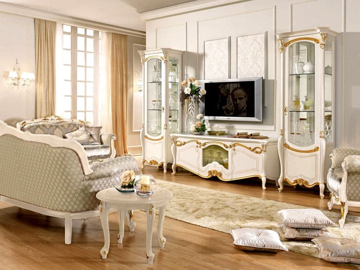 ארון בגדים מגולף מסיבי, שידת מגירות מעוטרת עשירה בדוגמאות, מראות במסגרות יקרות, קלמרים עם דלתות זכוכית ופנים כלים קריסטל מתאימים לסלון.