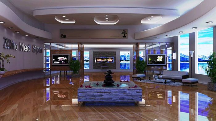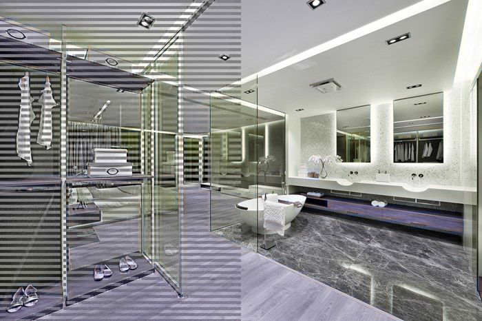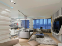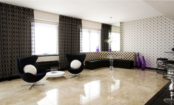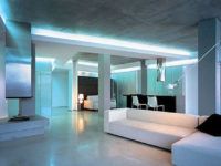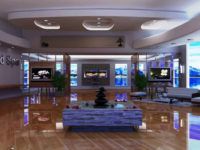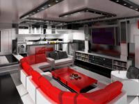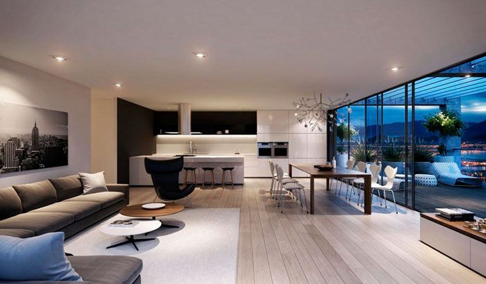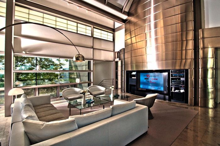 פנים הסלון בסגנון ההיי-טק הוא פלזמה ענקית עם מערכת סטריאו חזקה, אח חשמלית וריהוט מרופד בעל צורה גיאומטרית קפדנית. זו רצפה מבריקה, המשקפת את התאורה של תקרה רב-מפלסית, וענקית חלונות פנורמיים.
