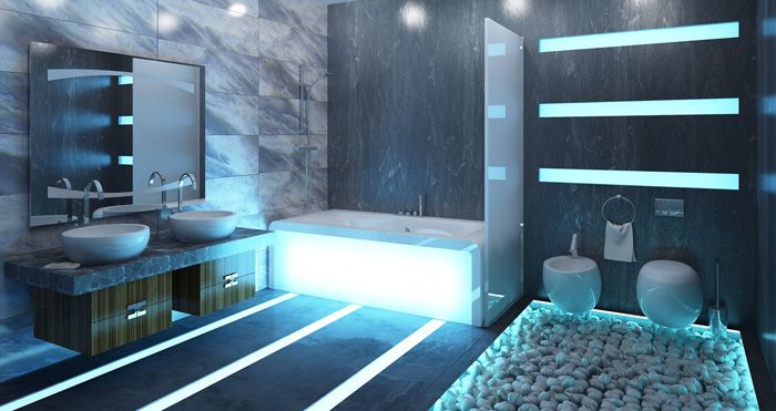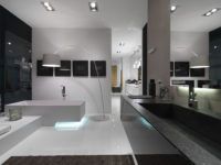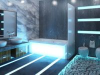 חדר אמבטיה בהיי-טק נראה אלגנטי להפליא. אור ממגוון זרקורים ישקף באלמנטים מתכתיים, על משטחים מבריקים, נצנצים במים. האמבטיות מוגמרות באריחים רגילים, כלים סניטריים לבנים כשלג עם אביזרים אולטרה מודרניים ומספר גדול של אלמנטים מזכוכית.