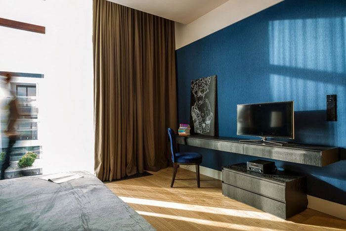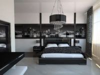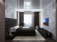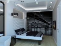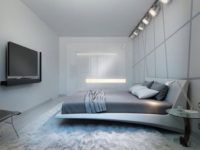 המיטה לחדר השינה נבחרה גם היא רב תכליתית - עם שטח אחסון ושולחנות לילה נפתחים. רהיטים תלויים ללא רגליים (מיטות, ארונות בגדים, ארונות וכו ') נראים ממשיים ואופנתיים. נראה שהמוצר צף באוויר, ונראה סוריאליסטי משהו. הרושם שמייצרים דגמים מקוריים כאלה תואם למדי את אווירת סגנון ההיי-טק.