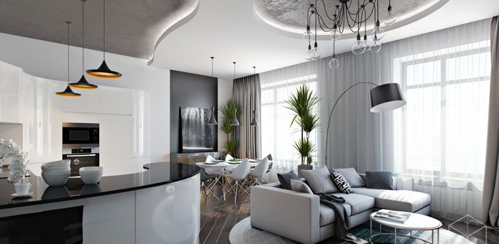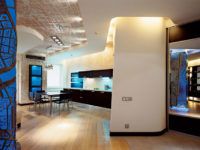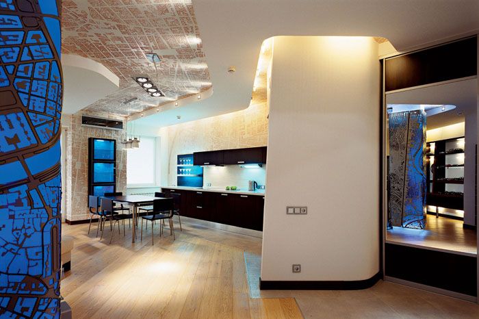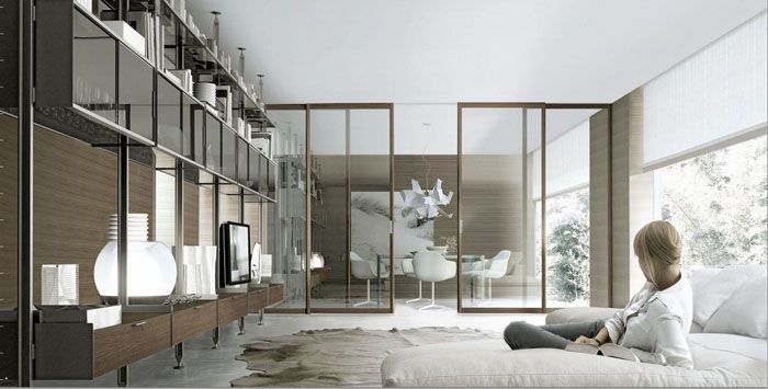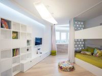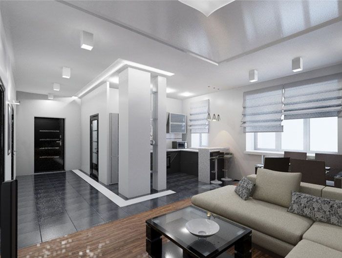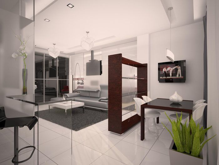 יעוד חלל ברור מושג בשתי דרכים: על ידי התקנת מחיצות וחלוקת אזורים פונקציונליים באמצעות אלמנטים שונים של תאורה. מסכי הזכוכית והזזה מפלסטיק הם אידיאליים כמחיצות.