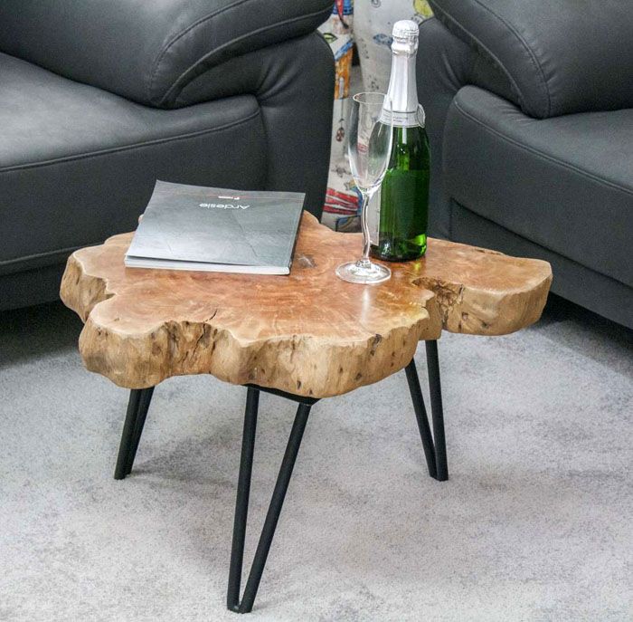 אם לוקחים רגליים ממתכת ומסור שנחתך מעץ גדול, תוכלו להוסיף טוויסט מעניין לסלון. זו לא האפשרות הקשה ביותר להכנת שולחן.