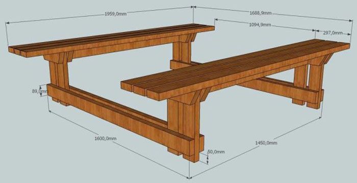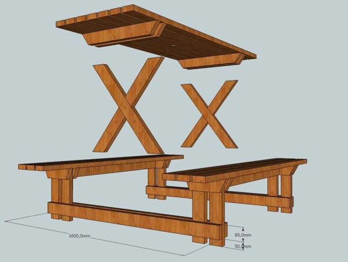 - כדי ליצור את הרגליים הצולבות צריך לקחת שני לוחות ולחצות אותם כך שיהיו 64.5 ס"מ בין הקצוות שלהם. עדיף לסמן את הצומת בעפרון פשוט. כדי להתחבר, עליך ליצור חריץ: עובי הלוח נחתך לחצי לגודל הלוח השני. יש צורך באותה חריץ בלוח אחר. אתה צריך לתקן הכל בארבעה ציפורניים. הרגליים מחוברות לספסלים, מחשבות מרחק שווה מכל אחת מהן. אלמנטים הצלביים המורכבים מחוברים לראש השולחן.
