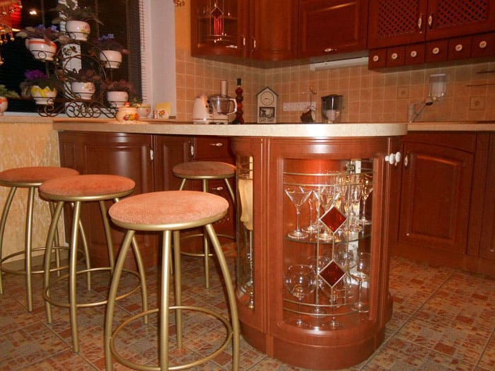 מוצרי עץ יפהפיים, העיצוב שלהם מוצק ומונומנטלי, קליל ומסובך. רהיטי מטבח כאלה יכולים להיות פשוטים או מגולפים גיאומטרית.