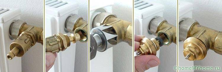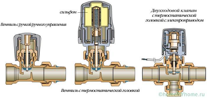 לפיכך, שסתום נחתך תחילה לצינור אספקת נוזל הקירור לרדיאטור החימום, ראש תרמי מוברג עליו בניצב לזרימת הנוזל. יש כמה שינויים בראש התרמי: