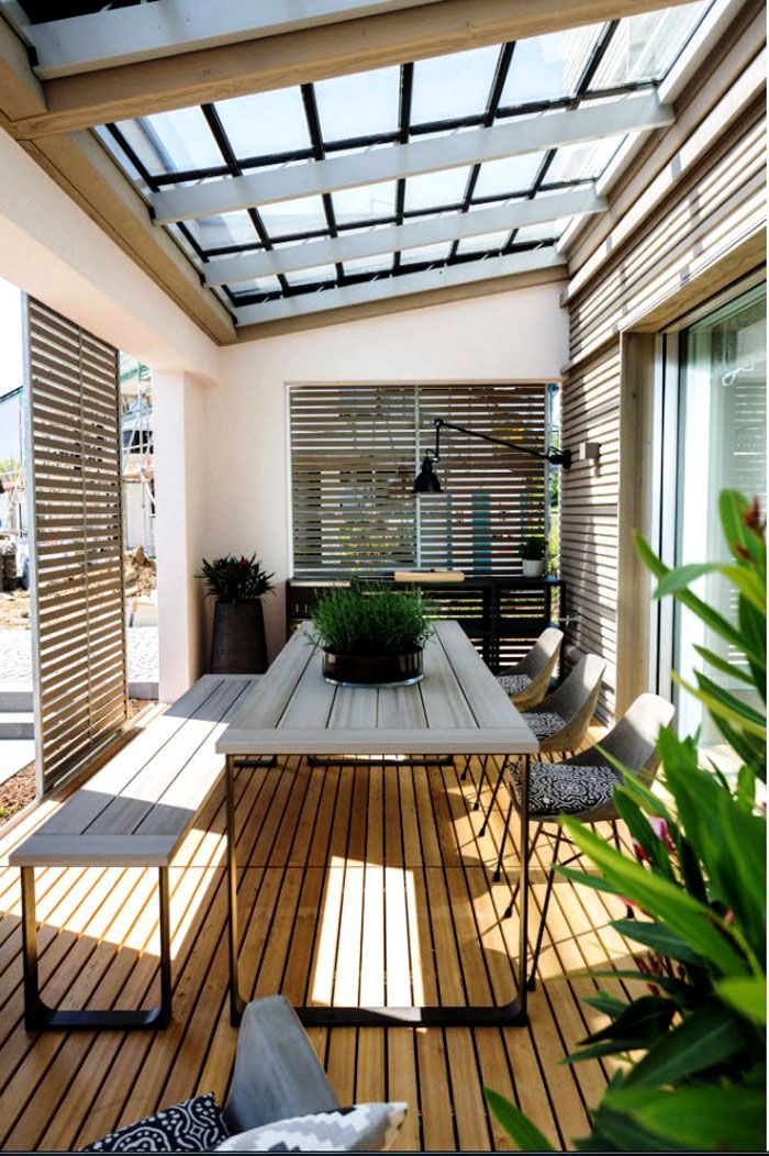 הטרסה והמרפסת יכולה להיות פתוחה או סגורה. בפרט, במהלך בניית מרפסת מקורה, יש לצפות מראש בנוכחותה בשלב עיצוב בתים... זה יאפשר לך לבנות מראש מבנה מוצק עם משותף קרן ו גג... בנוסף, בהיותה מרכיב מבני של המבנה הראשי, המרפסת כפופה לאישור. גם אם הוא מתוכנן להתווסף מאוחר יותר, יהיה צורך לפתח ולהסכים על סט תיעוד תכנון עם חישובי המבנים העיקריים.