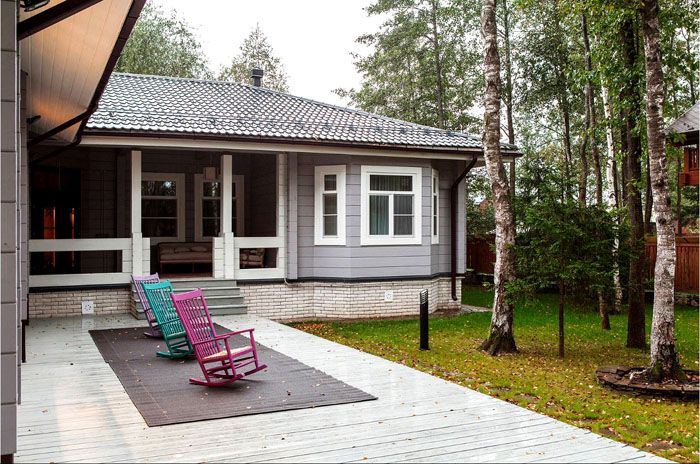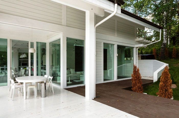 המרפסת סביב השטח של הבניין הראשי נוחה מסיבות רבות. אם מעליו מותקנת חופה, הדבר מאפשר הצללה נוספת של שטחי הבית. ניתן לארגן גישה לשטחה מכל חדר הצמוד למרפסת, מה שמגדיל משמעותית את הפונקציונליות והנוחות של מגורים בבית כזה. לדוגמא, ניתן לארגן פינת אוכל ליד המטבח במרפסת, ולאחר שעזבתם את חדר השינה תוכלו למצוא את עצמכם באזור בילוי באוויר הפתוח. ביציאה מהסלון תוכלו מיד למצוא את עצמכם על הרציף ליד הבריכה. מרפסת מסילה יכולה להשפיע לטובה על החיצוני של הבית ולהיות פלטפורמה לתוספת קישוט החזית, למשל, יצירות מ צמחים חיים.