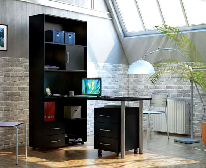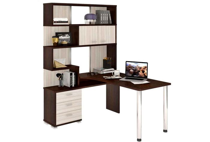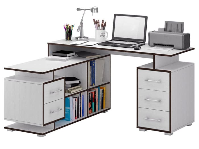 למי שמעדיף תנאי עבודה נוחים זה לא ייראה כחיסרון. אתה יכול לשבת בנוחות ליד שולחן כזה. בתצורה זו ניתנים טופס אלמנטים מבניים נוספים מדפים ו מדפים... היצרנים מוסיפים גם קופסאות, סטנדים, כנים, נישות עבור ציוד משרדי וניירות.
