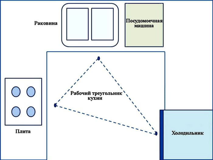 על המשולש הזהוב כבר נאמר, אך יש להוסיף כי בשום מקרה אסור להניח לידו כיור וכיריים. יש להפריד אותם על ידי חלק מהמשטח, ומנדף צריך להיות ממוקם מעל התנור. אם זה לא נעשה, הארונות מעל הכיריים יתדרדרו תוך זמן קצר.
