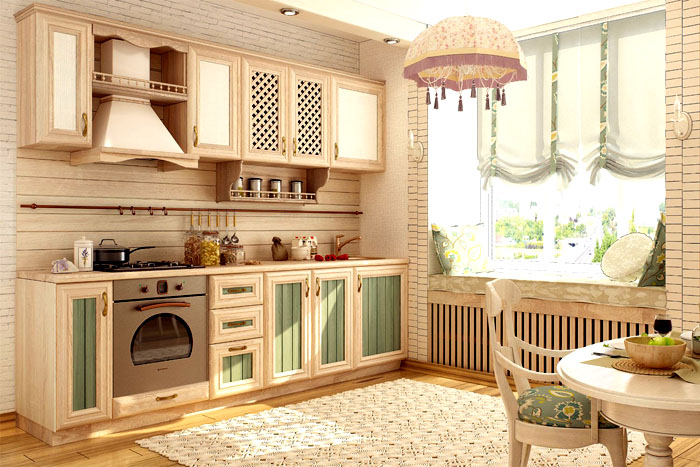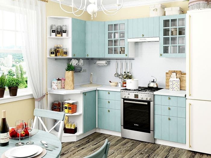 יש לבחור יחידות קיר ורצפה עם המספר המרבי של המגירות והמדפים הפנימיים, מכיוון שזו תהיה מערכת האחסון היחידה במטבח.העיצוב החיצוני של האוזניות ירחיב את החלל חזותית אם הוא עשוי בצבעים בהירים.
