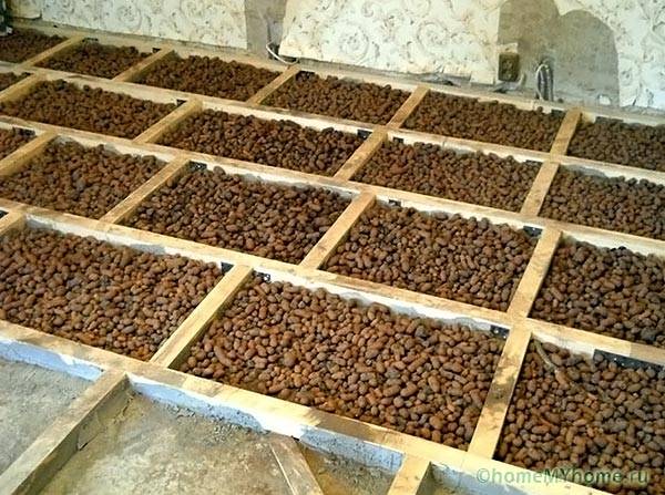 - חימר מורחב - חצץ עם כדורים של 10 - 40 מ"מ מוזג בין בולי העץ, חול 1 - 7 מ"מ משמש במשטחים יבשים;
