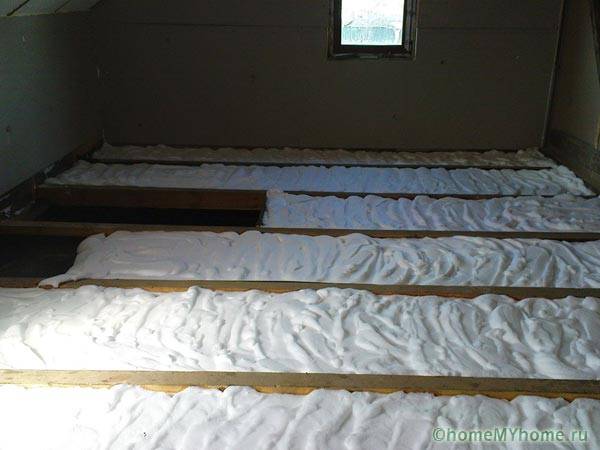 בכל מקרה, פוליסטירן מורחב, חימר מורחב, לוח מינרלים, צמר אקולוגי מונחים בין הקורות, לוחות הלשון והחריץ מחוברים על גבי העץ או דִיקְט למינציה, פרקט וציפויים אחרים. מחסום האדים דומה לחלוטין למקרה הקודם.