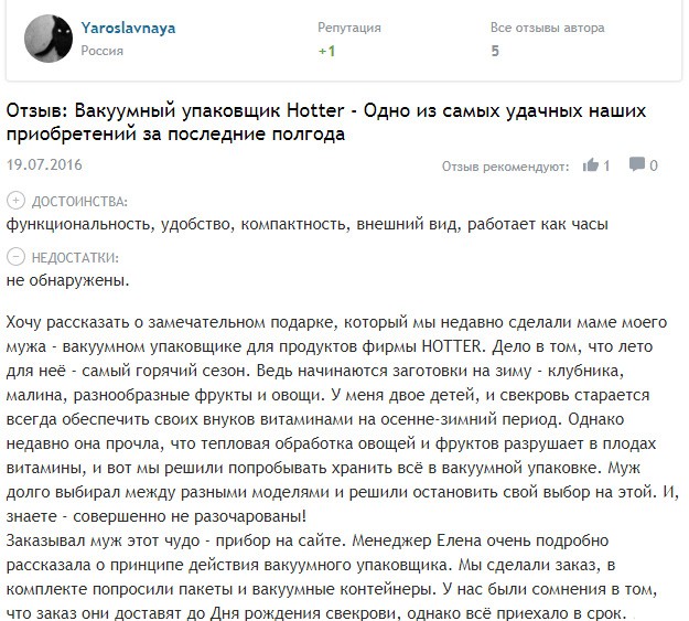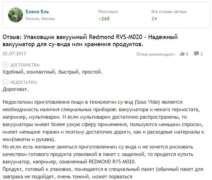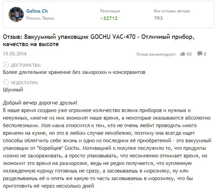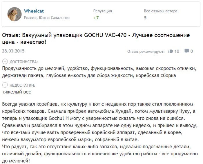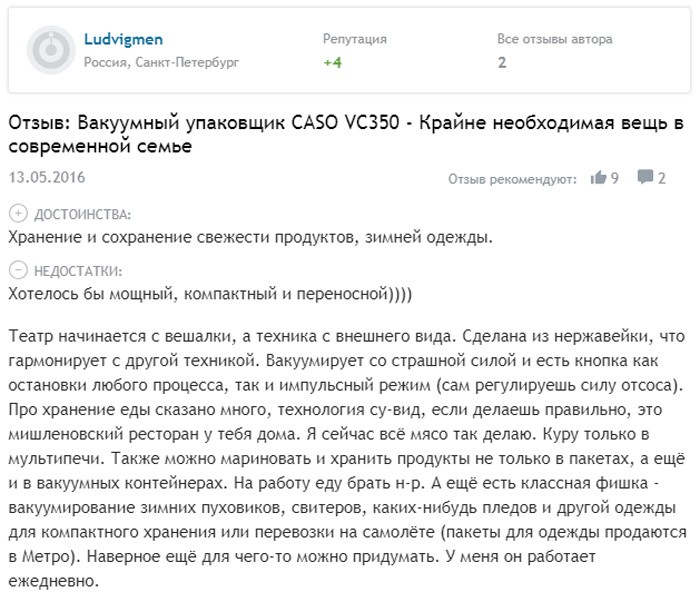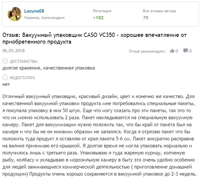 מכונת ואקום יקרה למדי, אך פונקציונלית לאריזת מזון תמורת 15,500 רובל. רשימת התכונות שלו כוללת מצב דופק, בקרת טמפרטורת התפר, שני מצבים למוצרים יבשים ורטובים. הרוחב המרבי של האריזה בה משתמשים הוא 30 ס"מ. צריכת החשמל היא 120 וואט בלבד. שליטה אלקטרונית.