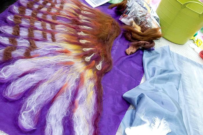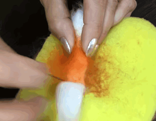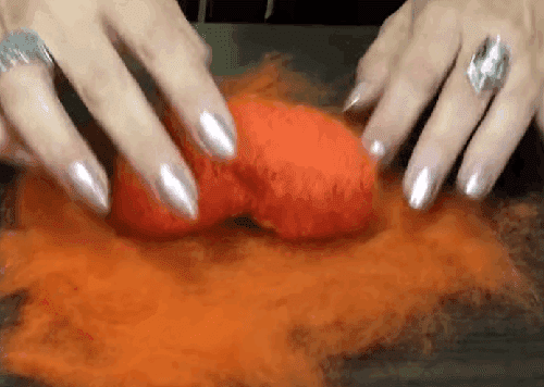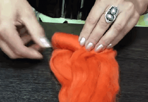 - אנחנו לוקחים צמר קרד כתום ועושים את הלבד הרטוב הסופי.