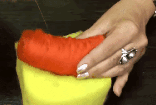 - אנו מרטיבים במים וסבון ומועכים בעדינות את סיבי הצמר דרך הרשת ויוצרים צורת מגפיים ואז עוטפים אותם בתבנית.