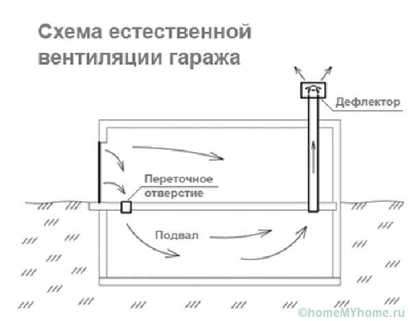 בשל פעולתו התקופתית של בניין זה, עדיף אוורור טבעי לא נדיף דרך פתחי אוורור או צינורות אוויר. בעת תכנון אוורור במוסך במו ידיך, התרשים והתמונה עשויים להיות שונים מעט בהתאם לנוכחות מחתרת מרתפי אחסון ירקות.