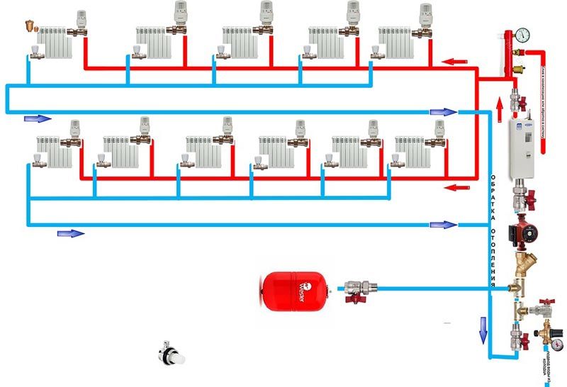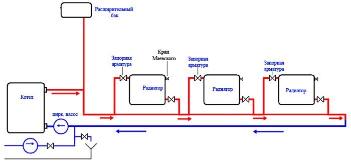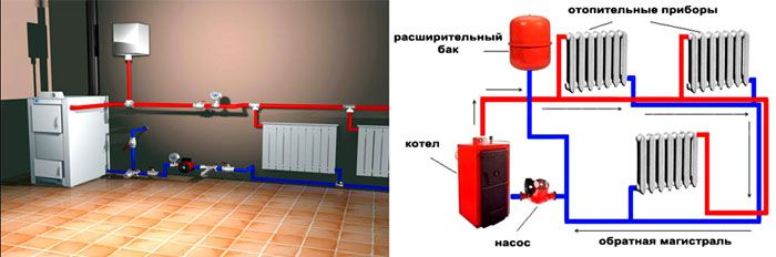 תוכנית זו שונה מקודמתה לא רק בנוכחות משאבה, אלא גם בסידור הצינורות. אין צורך להתקין אותו בזווית. זה חשוב מאוד עבור אלה שמרכיבים את מעגל החימום בפעם הראשונה בעצמם.