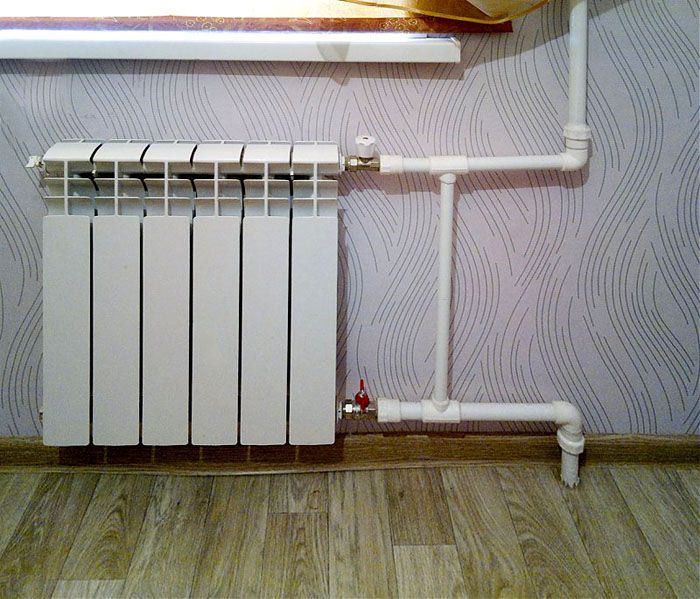 - כאשר נמשך צינור אופקי אחד, וממנו אל הרדיאטורים, מעלות מצינורות בקוטר קטן מורידות מלמעלה.