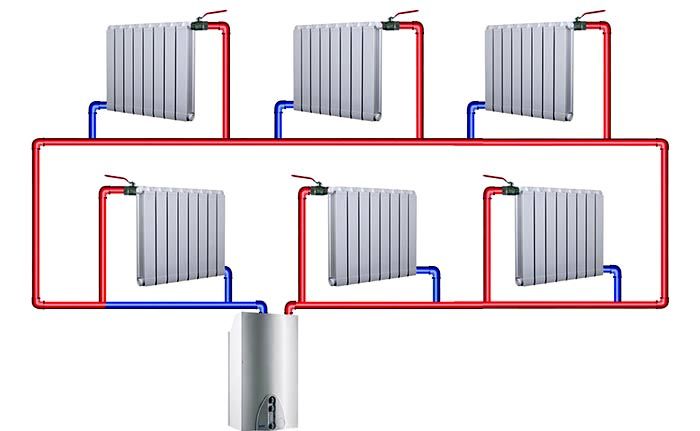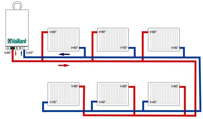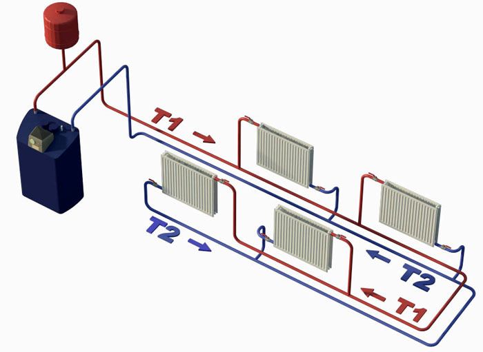מערכת התקנת מים זו מורכבת יותר ומשתמשת ביותר חומרים. אבל זה עובד הרבה יותר טוב מקטרת אחת. מבנית טהורה, מתווה הצינור בו מורכב משני מעגלים: אספקה והחזרה. יש לציין ששני הצינורות עיוורים ומחוברים זה לזה רק באמצעות רדיאטורים ודוד חימום. לפי השמות עצמם, מתברר כי נוזל קירור מחומם מסופק לרדיאטורים לאורך מעגל האספקה, והמצונן מקורר לדוד באמצעות הקירור ההפוך.