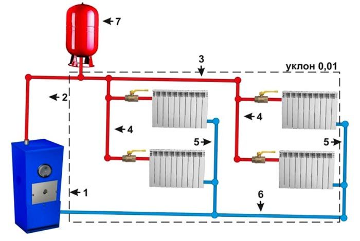 שימו לב לתמונה למעלה. זה מראה בבירור את החלקים של מערכת החימום, כאשר "1" הוא המעגל הכללי, "2" הוא העלייה הראשית מהדוד, "3" הוא קטע אופקי עם שיפוע, הממוקם בדרך כלל בעליית הגג. "4" - אלה עליות המספקות את נוזל הקירור לרדיאטורים. "5" - עליות המוציאות את נוזל הקירור מהסוללות ו" 6 "- זהו קו החזרה.