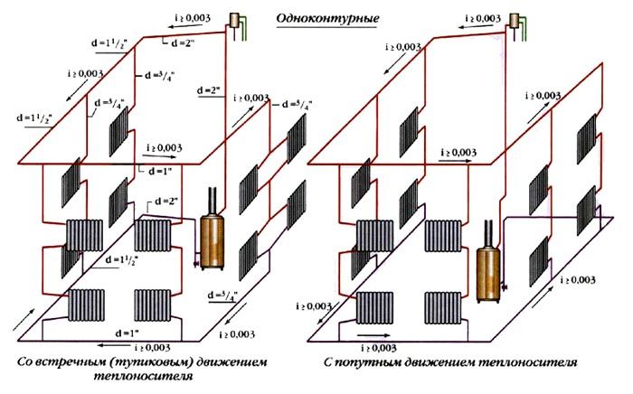 אבל אם בית פרטי קטן ב- 3 ÷ 6 חדרים, אז מערכת חימום בצינור אחד בו מוצדקת בשל קלות ההתקנה במו ידיך, בתוספת מספר קטן של צינורות, שסתומים ואביזרים. כלומר, זו האופציה החסכונית ביותר מבחינת הבנייה. התוכנית וההליך להתקנת חימום צינור אחד, למרות שהם נחשבים פשוטים, אך עדיין האחריות על הפעולות שבוצעו גבוהה. זה נכון במיוחד עבור מערכות עם זרימה טבעית של נוזל הקירור. חשוב כאן להתבונן במדויק בשיפוע ניתוב הצינור.