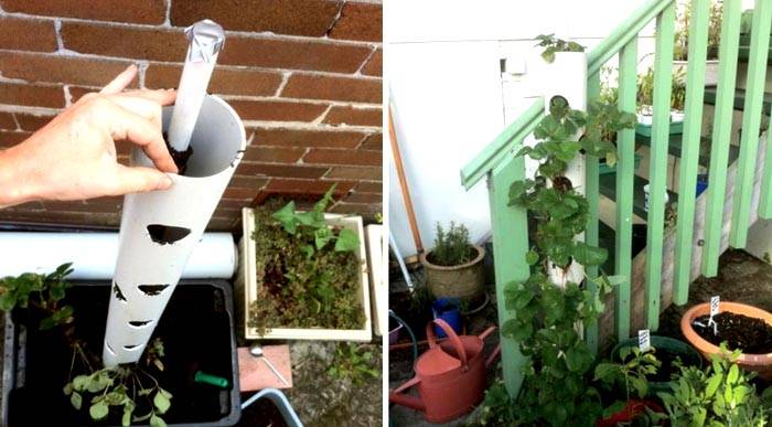 לאחר הצינור מהודק היטב, אנו ממלאים את האדמה שהוכנה בעבר לתוך החורים. יחד עם זאת, אין צורך לקנות תערובת מיוחדת, אם יש אדמה פורייה באתר, אתה יכול להשתמש בה. ניתן לערבב זרעי תות (או צמח אחר) ישירות לתוך האדמה או להוסיף אותם מאוחר יותר בחורים (שזו האופציה הטובה ביותר).השקיית המערכת מתבצעת מלמעלה, בעוד שהמים לא זורמים לצמחים באופן שווה למדי, לכן עדיף ליצור מערכת דו-צינורית.