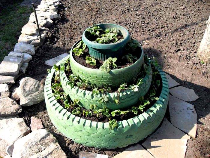 אתה יכול גם לחתוך חריצים בצמיגים, ואז הצמחייה תהיה לא רק על משטחים אופקיים, אלא לאורך כל המבנה.