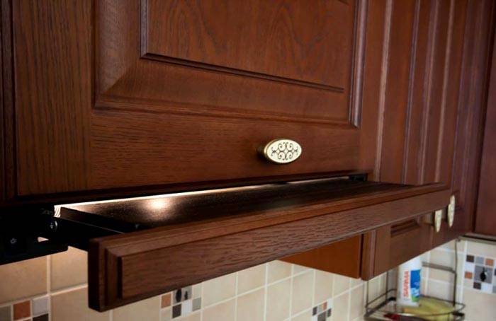 - בהשוואה לאפשרויות אחרות, הם כמעט לא תופסים מקום ואינם בולטים. במקרה זה, החלק העיקרי מוסר לתוך הארון, ומשטח הנסיגה נשאר פתוח;
