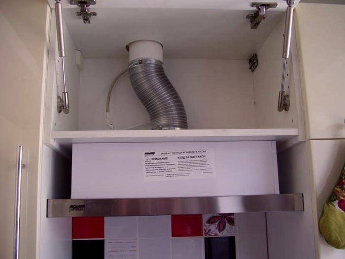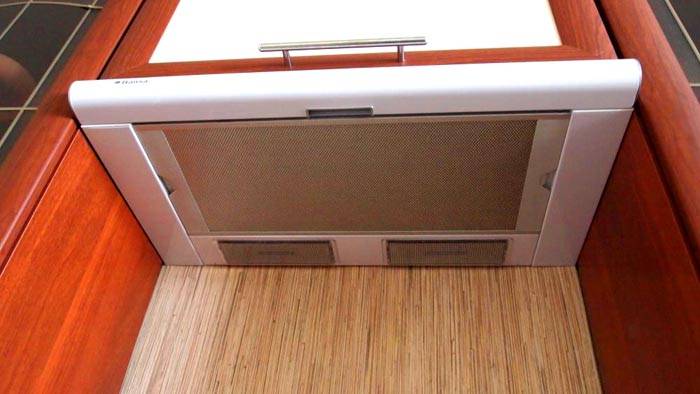 לרוב, הציוד מובנה בארון קיר. רוחב המבנה חייב להתאים למידות מכסה המנוע. כדי להתקין את היחידה, עליך להסיר את הקיר התחתון של הארון, ולתקן את מכסה המנוע בעזרת ברגים הקשה עצמית.