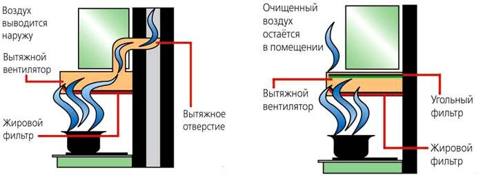 ברדסים מוצגים בשני סוגים עיקריים. מערכות זרימה או פינוי פינוי אוויר מלוכלך דרך פיר האוורור. מערכת המחזור מתפקדת כמבנה סגור. כלומר, אין צורך בתעלות אוויר מיוחדות. לא נדרש מאמץ רב להתקנת טכניקה כזו. המוני אוויר מלוכלכים עוברים דרך המסננים כדי להסיר ריח רע ושפרישי שומן.