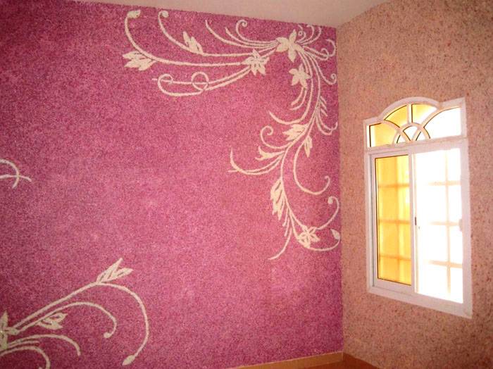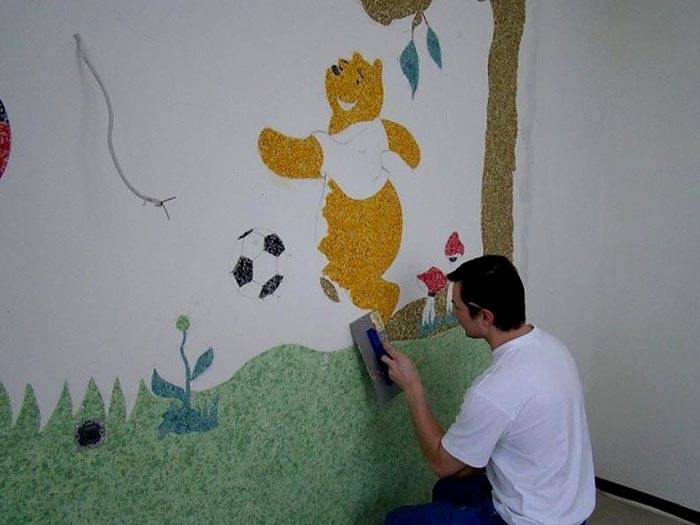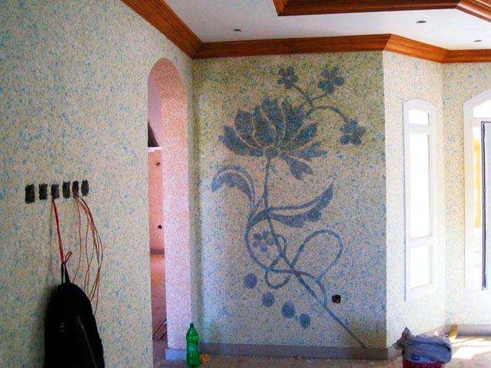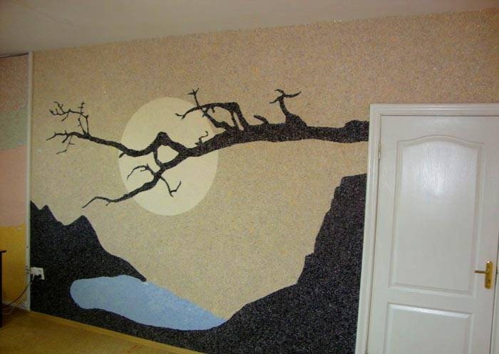 אם הציפוי האחיד הרגיל נראה לכם משעמם מדי, שימו לב לטכניקות העיצוב. אחת מהן היא קישוט הקירות במו ידיך ברישומים. טפט נוזלי מאפשר ליצור קומפוזיציות רב צבעוניות עם הקלה מורכבת.