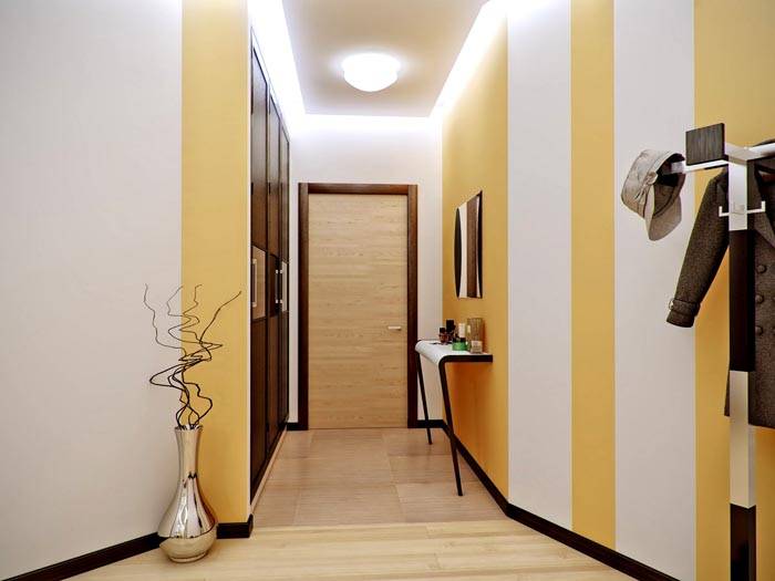בהתחשב בכך, כי ככלל, אין חלונות במסדרון, יש לבחור צבעים בהירים לקישוט. אל תשתמש בטפט נוזלי עם צבעים בהירים מדי. אם יש תקרות נמוכות במסדרון, ניתן לבצע מעבר חלק של שני גוונים: גוון בהיר מעל, כהה יותר בתחתית.
